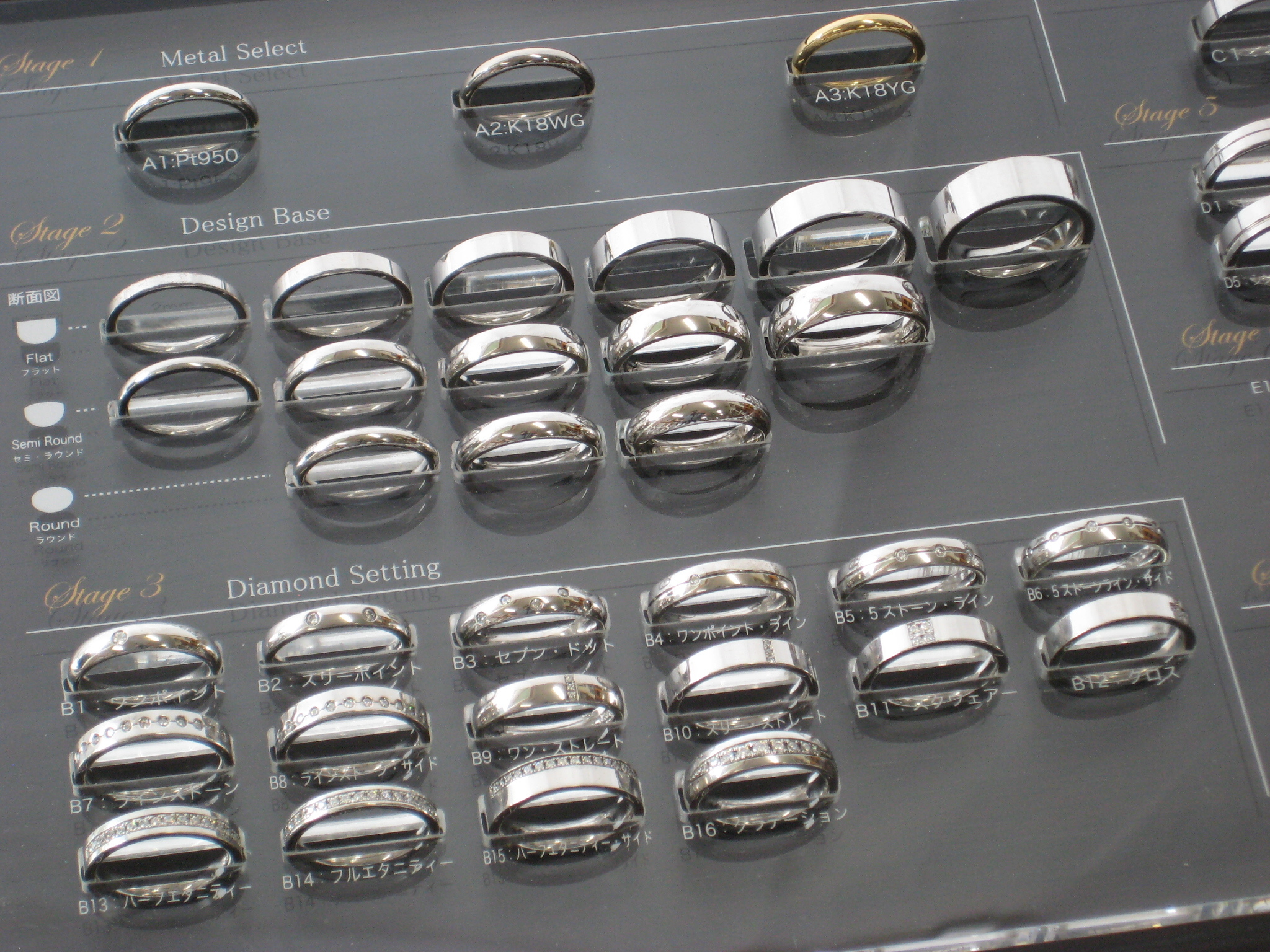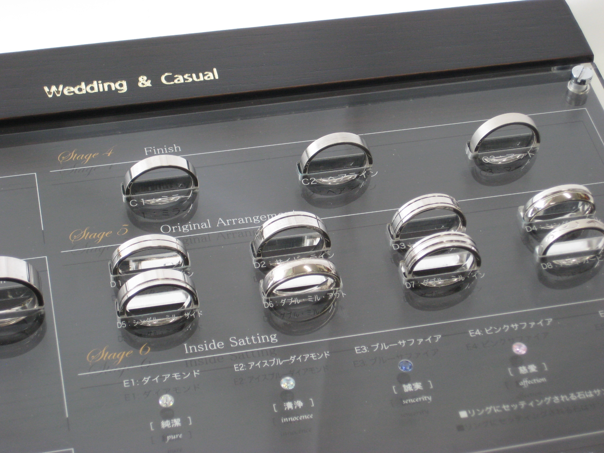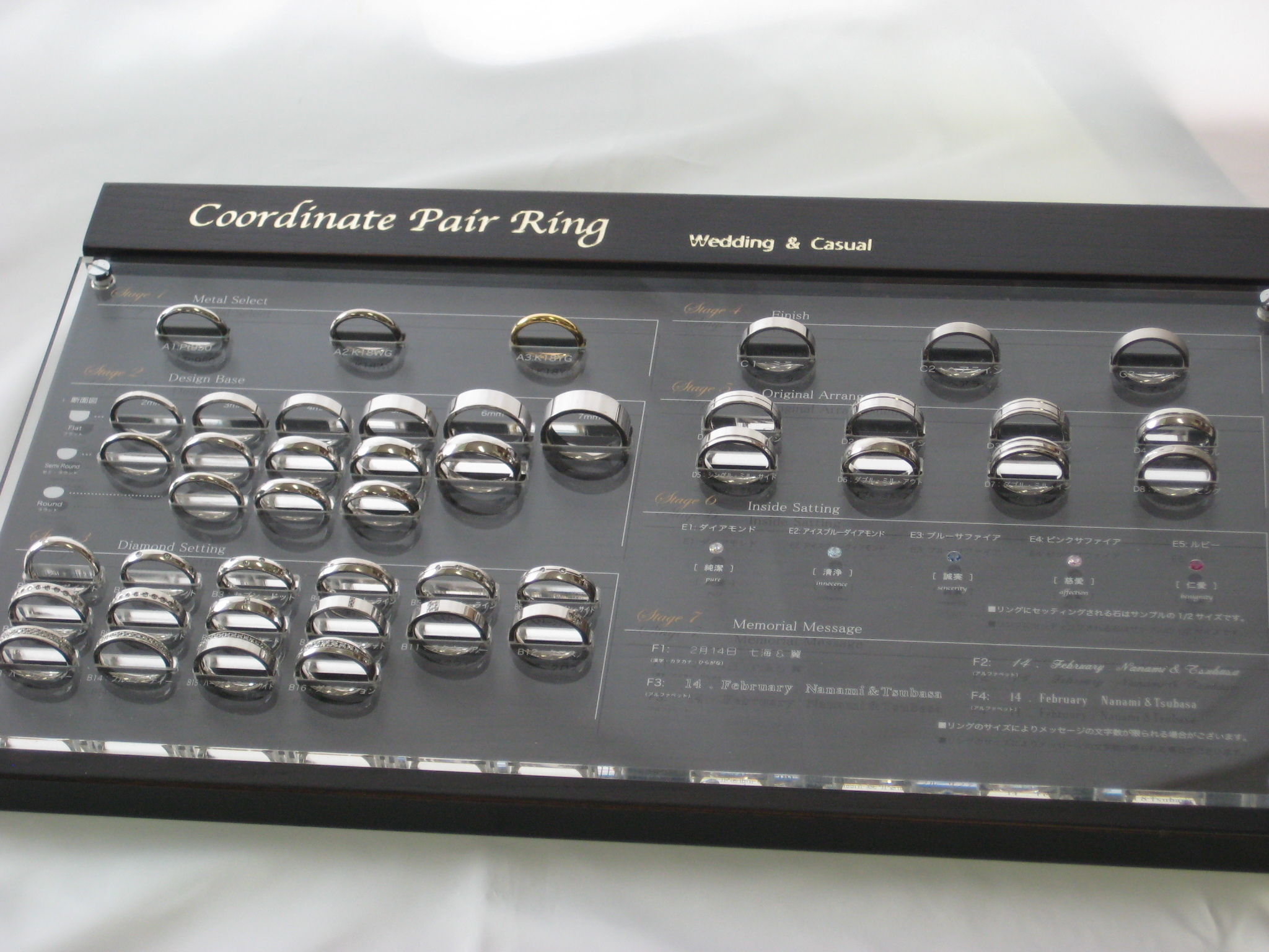 7つのステージから「素材」「デザイン」「リング幅」「ダイアモンド・セッティング」「仕上げ」「インサイド・セッティング」「メモリアルメッセージ」を組み合わせ、二人だけのオリジナルペアリングを作ります。